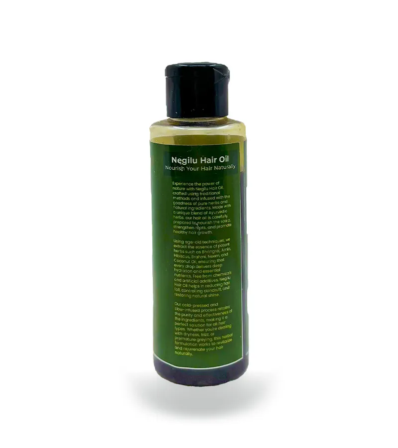 Infused with a powerful blend of time-tested herbs, Negilu's Herbal Hair Oil is your natural solution to stronger, shinier, and healthier hair. This botanical elixir nourishes the scalp, promotes hair growth, and restores the natural vitality of your strands. Experience the essence of Ayurveda in every drop, crafted to revive your roots and transform your hair from the inside out.